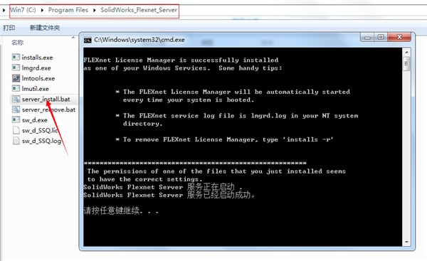 4、以管理员身份运行“ SolidWorks_Flexnet_Server server_install.bat”,然后等待直到新服务,将安装并启动“ SolidWorks Flexnet服务器”