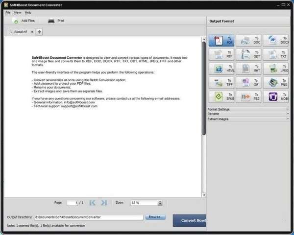 Soft4Boost Document Converter是一款文档转换器,功能齐全,可以帮助用户把文档从一个格式转换为另一种格式,支持PDF,DOC,TIFF,txt,RTF,ODT,JPEG等格式。