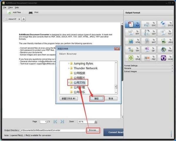 接下来我们来设置一下转换格式后的文件存放路径。点击Soft4Boost Document Converter底部的Browse浏览,打开文件夹选择窗口。选择格式转换文件输出的文件夹后点击确定就可以完成文件输出路径修改;