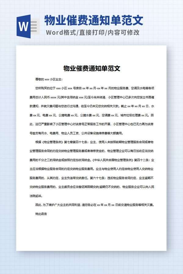 物业催费通知单范文是为了规范物业收取业主的物业费流程所提供的范本模板。物业催费通知单范文由PK游戏网为您提供免费下载,源文件为Word格式模板,大家可以直接下载源文件,以便于修改内容。