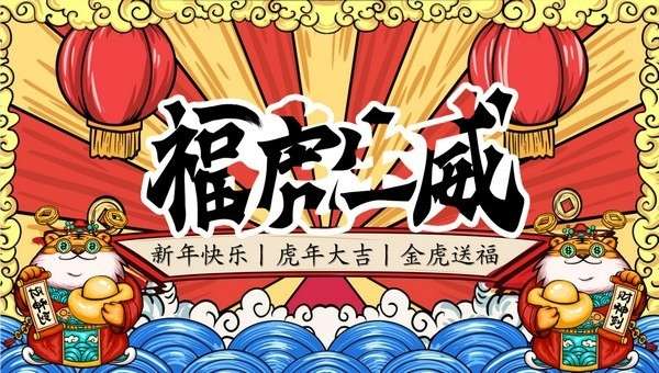 PPT模板封面使用了国潮风绘制的红黄放射图案、蓝色波涛、红色灯笼,和两只卡通可爱的小老虎背景图片。中间填写福虎生威 2022虎年新年PPT标题。界面精美喜庆。