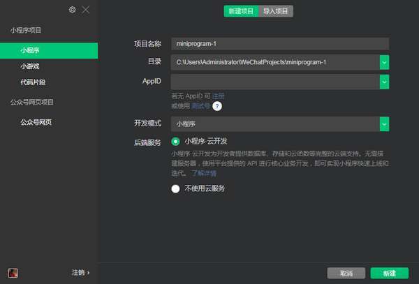 三、按照自己的需求可以在小程序、小游戏点击新建或者导入项目制作新的程序。