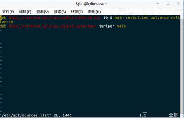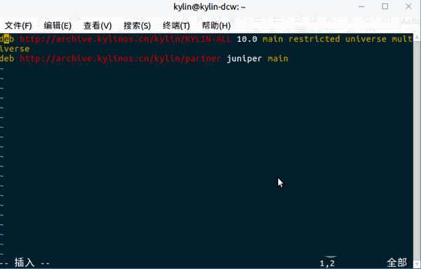 1、在图片2所在界面,按键盘上字母“a”,按下后,会看到界面左下角内容由图片2的“etc/apt/sources.list”变为如下图所示的“-- 插入 -- ”,在此状态下,可以通过键盘将正确的源地址填入。