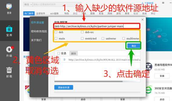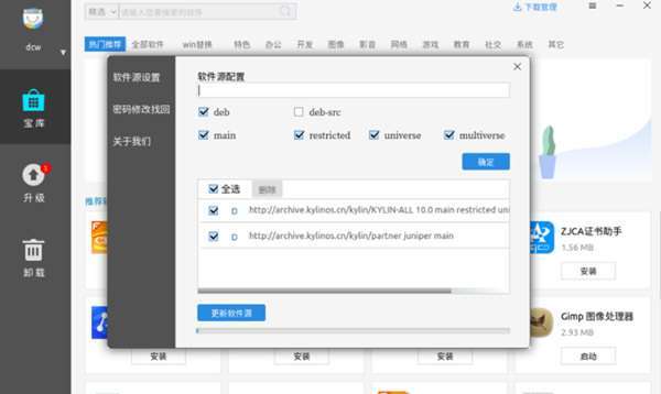 3、到此,软件源添加完毕,重新打开软件商店,在商店内的软件源配置界面,全选并且更新软件源后,即可正常使用麒麟软件商店下载和安装商店内的各种软件。