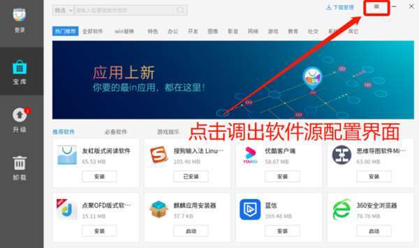 1、点击【麒麟软件商店】界面的右上角,打开软件源配置界面。