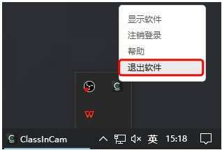 为了防止上课时误点而中断视频流,点击ClassInCam右上方关闭图标只能将软件最小化至系统托盘后台运行。如需彻底退出软件,用户需在托盘右键选择退出软件。