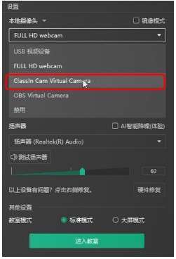 进入ClassIn教室后,在选择本地摄像头时,选择ClassInCam Virtual Camera即可调用ClassInCam 预览区域内的画面。