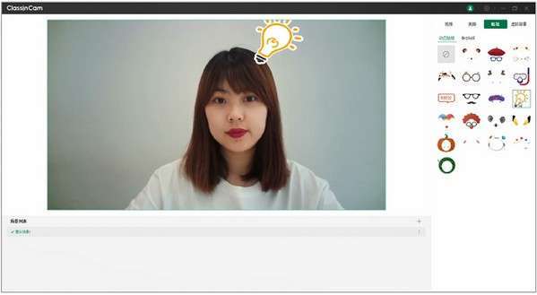 ClassInCam提供动态和静态贴纸。AI动态贴纸可应用于所有场景中,可自动识别人脸。静态贴纸支持用户自定义上传,每个场景中最多可支持插入10个静态贴纸。