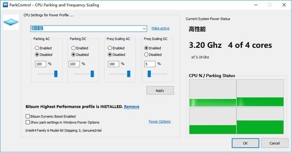 Bitsum ParkControl PRO官方版软件支持CPU控制、Bitsum动态加速、电源计划自动优化、电源计划切换提醒等一系列功能,从电脑硬件底层优化您的电脑,大幅度提升电脑的运行速度。支持32位系统、64位系统。