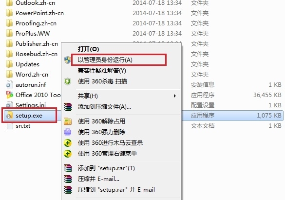 1.解压缩在PC下载网下载的office2010安装包,找到“setup.exe”文件,右键选择“以管理员身份运行”(如下图)