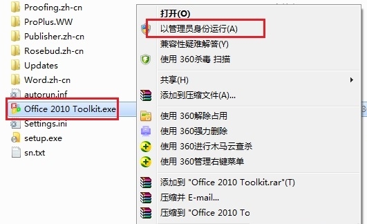 1.同样选择“以管理员身份运行”office 2010 toolkit.exe文件(如下图)