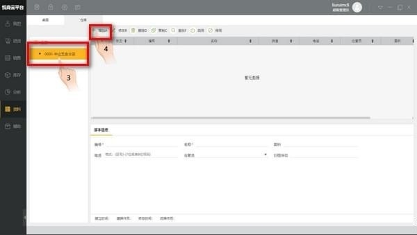打开软件选择“资料”在里面选择“仓库”(这里需要建立机构才能建立仓库)