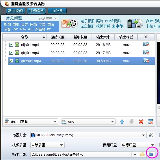 6、点击输出目录最后的文件夹图标,就可以打卡刚才转换好的视频了。
