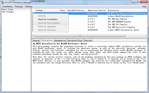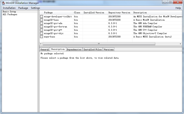 MinGW Installation最新版是一款十分出色的MinGW软件下载工具,MinGW Installation最新版界面简洁,功能强大,能够根据自身情况下载和安装MinGW的所有工具包,此外MinGW Installation官方版还包括mingw32-gcc-g++(GNU C++编译器)、mingw32-gcc-objc(GNU Objective-C编译器)、mingw32-gcc-ada(GNU Ada编译器)等等。
