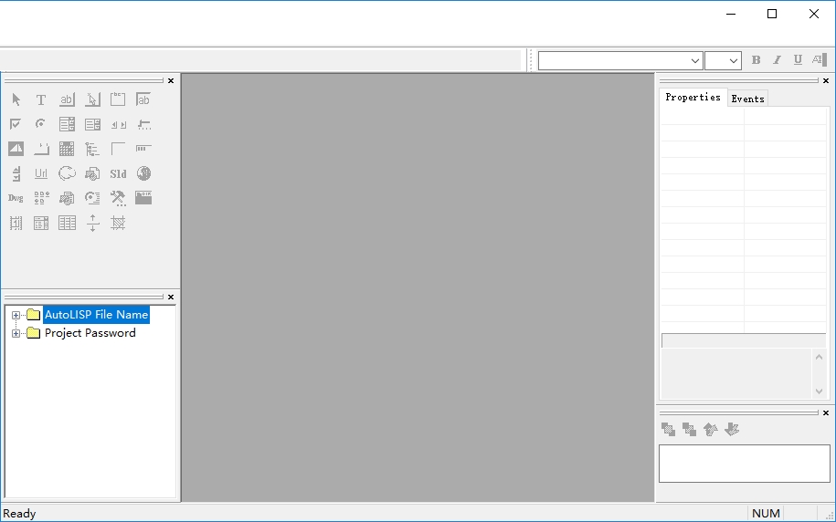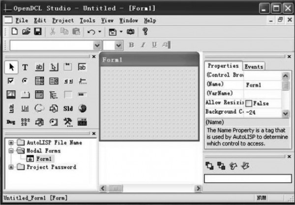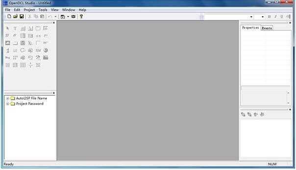 最后一个菜单项用来移除窗口,下拉菜单Tools的CopyEnents To C lipboard Pro ject和 Copy Enents To L isp F ile菜单项也非常重要,经常会用到,主要是把OpenDCL自动生成的Lisp语句复制到剪贴板或者相关联的Lisp文件中。在OpenDCL窗体的左侧,上面是控件工具箱(TooBox),OpenDCL提供多达35种控件可供使用,下面是工程结构树窗口(Pro jectTree)。在ObjecDCL窗体的右侧,上面是对话框控件属性(Properties)和事件(Events)窗口,下面是控件上下次序显示调整窗口(Z/Tab Oder)。ObjecDCL窗体的中间,就是摆放新创建的对话框的位置了,各工具栏和停靠栏位置是可以随意托动调整的。如下图所示: