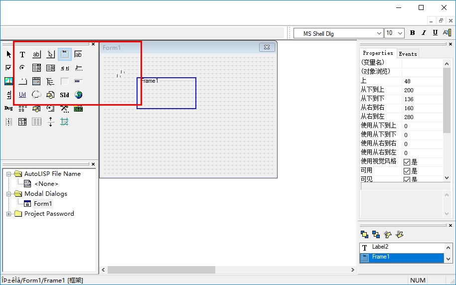 现在,通过单击“控制面板”工具箱上的按钮,在表单上放置“标签”和“文本按钮”,然后在表单的表面上拖出一个矩形。