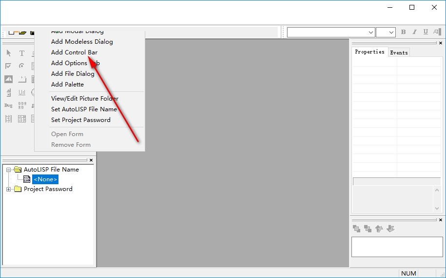 3、项目编辑的主要功能在这里显示,可以添加模态对话框、添加无模式对话框、添加控制栏、添加选项选项卡、添加文件对话框