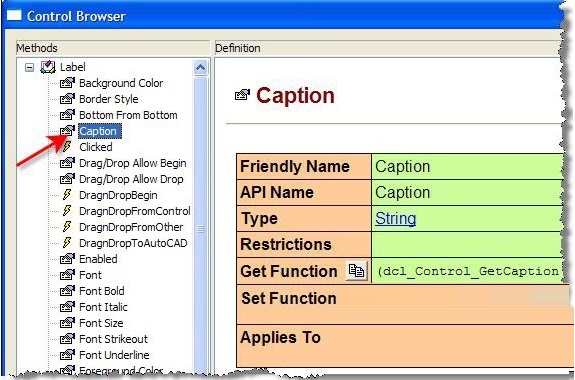 现在回到Studio中,双击Label1。 将打开一个名为“控制浏览器”的新窗口,其中包含可与Label控件一起使用的功能列表。 在左侧列表的顶部附近,单击“标题”属性。 右侧窗口显示有关使用的详细信息