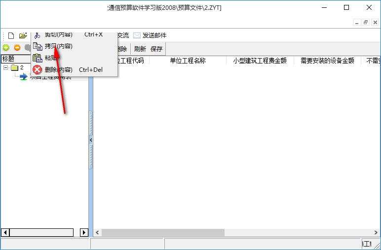 2、点击编辑功能,可以剪切、拷贝、粘贴、删除,支持显示单位工程名称、建筑工程费金额