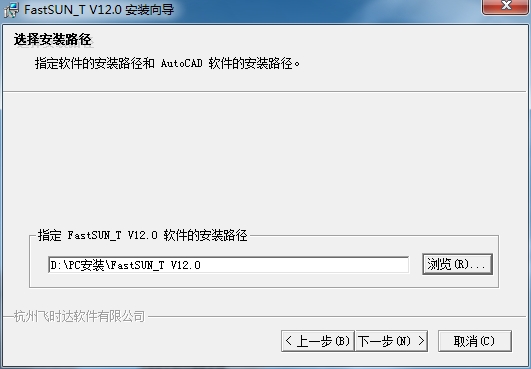 3、用鼠标点击“下一步”后将出现如下选择安装路径的画面,用户可以采用系统默认的安装路C:FastSoftFastSUN_T V12.0,也可以单击“浏览”自己选择适合的路径,推荐采用系统默认路径。