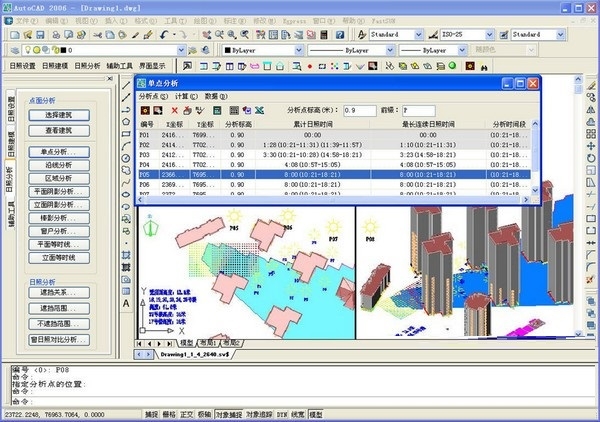 直接在图纸中点取。确定分析点之后程序自动计算出该点的X、Y坐标、累计日照时间、最长连续日照时间、分析时间段等数据,并在表格中表示出来。