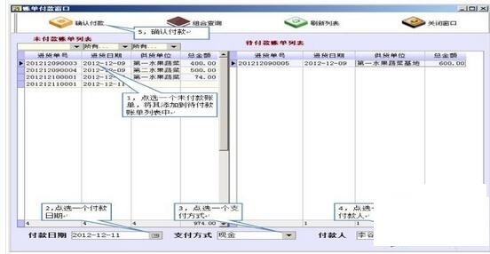 “结账付款”按钮是对选定的账单进行付款,这里只是对当前的单一账单进行付款。如对历史账单做批量付款,请点击本模块的“进货账单付款”菜单。