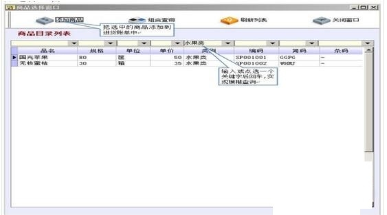 此窗口是货品目录信息,其设置是在“目录管理”模块中设置的。如果窗口中记录较多,请使用系统的查询功能查找需要的商品信息。关于窗口数据的查询:本系统采用三种方式实现了对数据的全方位查询,用户可以根据自己的查询习惯以及查询需求,选择其中一种使用。为了节省篇幅,本处不再重复介绍查询方法,请用户认真学习“附录:数据查询方法”章节。