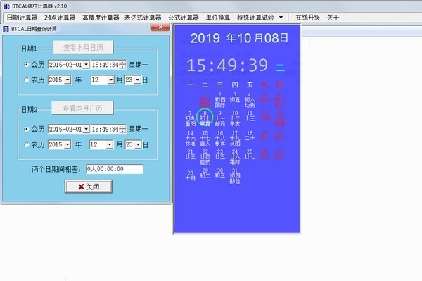 (2)内盖的白计算器,可以查询1900~2049年间公历、农历、节气、节白、数九、三优、梅、出梅等信息,可以实现公历、农历间的相 转换,计算两个日期之间相差天数。