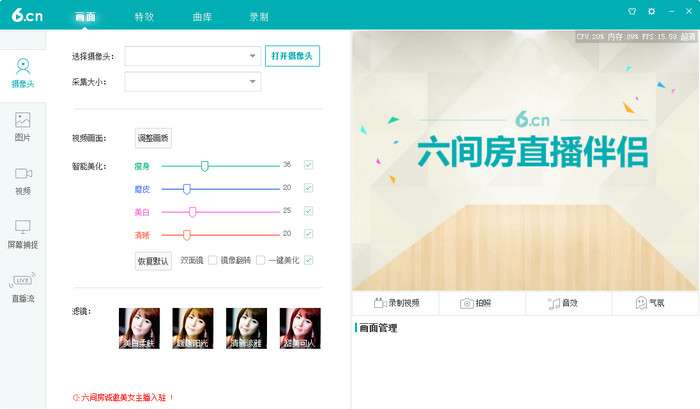 3.智能美化+滤镜,美化你的直播画面,美肤瘦脸,就要美美哒。