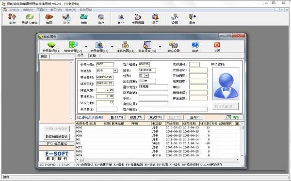 前台营业包括散客登记和会员登记。可在此进行衣柜管理和会员卡相关操作。会员卡支持照片,刷卡后可显示客户照片。