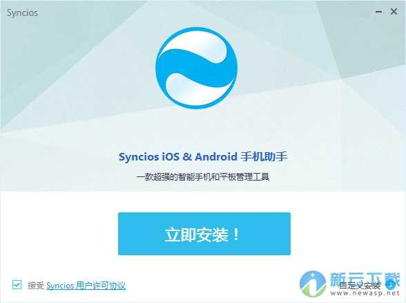 Syncios手机助手是一款强大的Android和iOS系统设备的数据管理器,为设备和电脑之间传输媒体文件提供最好的解决方案。作为一款Android和iOS 设备管理工具, Syncios 能够获取苹果设备(iPhone,iPad,iPod Touch)和Android手机中的任何文件,帮助你管理和备份应用程序、照片、音乐、铃声、视频和电子书到电脑。