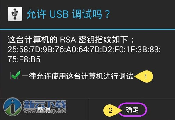 2、使用USB数据线连接安卓手机与电脑,如遇询问允许调试模式窗口,选择“一律允许使用这台计算机进行调试”后,点击“确定”。静待几秒,APP就安装成功了,不过也有某些品牌手机需要手动安装一下APP;
