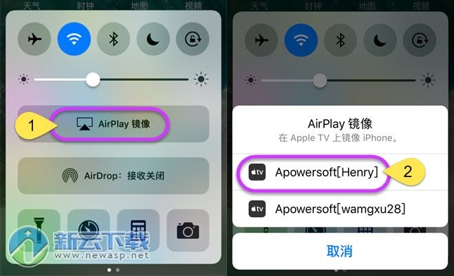 2、在iPhone主屏自下向上滑动,如果您是iOS 10系统及以上,点击“AirPlay镜像”后,选择“Apowersoft”选项;