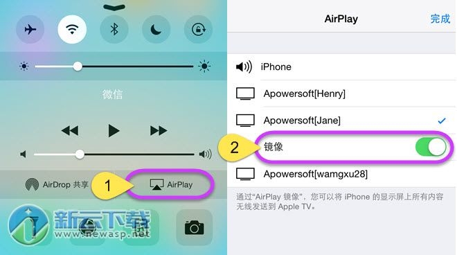 3、iOS 10及以下系统,点击“AirPlay”,选择“Apowersoft”名称设备后,开启镜像功能,手机画面就投射到电脑中了。