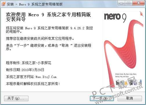 nero9中文免费版已经完全激活。自带VC++2005运行库,安装程序会自动为您安装。在Windows7下测试通过,以及Win7下的虚拟XP环境测试通过。这次发布的nero9精简版有点大,都将近40MB了,原因是保留了官方完整的“刻录”功能,支持添加媒体文件后自动转换功能,对刻录VCD、SVCD、DVD视频,甚至BD视频等都提供了良好的支持。