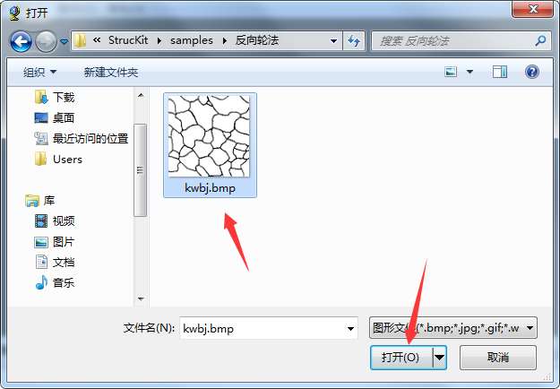 在反向轮法测应变窗口中,打开“文件/打开图象”菜单,进入打开图形文件窗口,可以在窗口中改变目录以便进行文件的选取,该窗口可以输入的图形文件格式有:*.bmp;*.jpg;*.jpeg;*.gif;*.wmf;*.emf等。选中需要使用的颗粒轮廓图形文件,单击“打开”按纽,返回上层窗口。