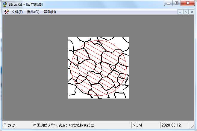 在反向轮法测应变窗口中,打开“操作/网格浏览”菜单,可以进行颗粒边界数目数据的查看;打开“文件/保存数据”菜单,可以保存数据结果;打开“文件/保存图象”菜单,可以保存颗粒图形;打开“文件/打印图片”菜单,可以打印颗粒图象。
