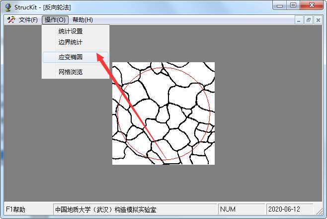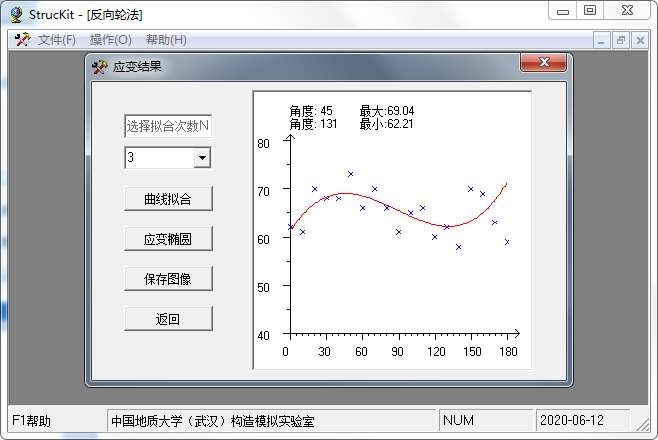 在反向轮法测应变窗口中,打开“操作/应变椭圆”菜单,进入反向轮法图形结果窗口。该窗口中,可以调整拟合曲线的次数,一般遵循的规律是:曲线拟合次数一般在3—5较好,使拟合曲线接近于正弦或余弦形态,曲线最高点与最底点的角度值相差近于90度。单击“曲线拟合”按纽,颗粒边界数目与角度关系便拟合出来;单击“应变椭圆”按纽,颗粒变形的应变椭圆被显示出来。单击“保存图象”按纽,可以保存按纽右边显示的图象,图象可以是拟合曲线或应变椭圆。