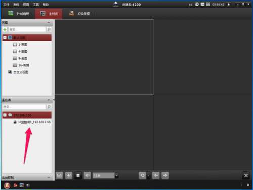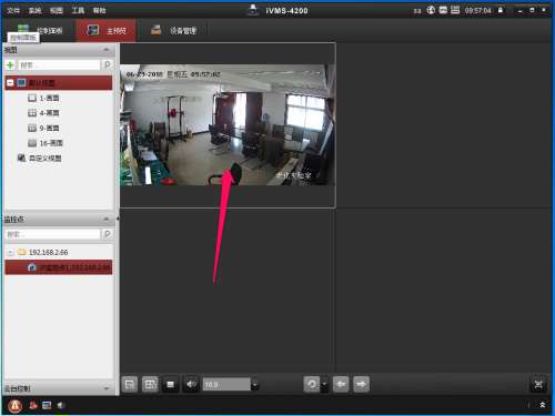 然后弹出 主预览 的界面,在主预览界面的左下角的 监控点栏目 下,我们可以看到之前刚刚添加的设备,如下图: