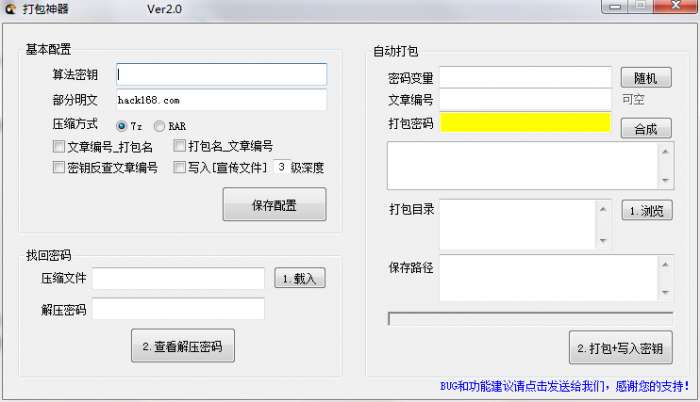 打包神器官方版是一款实用快速的一键打包工具。打包神器最新版可以帮助用户把多个文件打包,生成7z和rar两种方式,可以使用加密方式打包,密钥可以自动生成,自动加入宣传广告。使用打包神器官方版时增加目录"宣传文件"下文件自动复制到打包目录,可选复制深度。