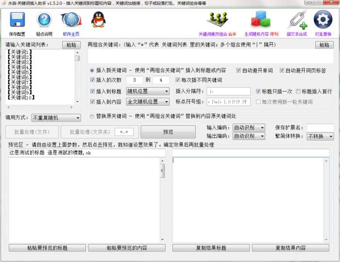关键词插入助手是一款整合型关键词插入工具。支持强大丰富的插入选项,可插入到文章的标题和内容,插入关键词可智能避免割断网页标签和英文单词;内置的打乱器,可以保持原空行、标点符号等不变,变得只是文字位置。
