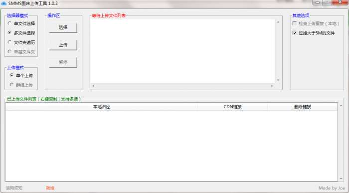 如果你和我一样平时喜欢上传图片的话,一定也会经常烦恼为什么图床不支持批量上传,或者上传之后需要一张张的复制图片链接。 烦恼多时后,这个小东西就出来了。它可以帮你把图片批量上传到ftp服务器,然后把相应的URL链接全部复制到系统剪贴板或保存为文本文件。 使用方法很简单,选择图床服务器后选择图片文件,然后软件就开始上传,上传完毕后会把图片URL链接复制到系统剪贴板或保存为文本文件。