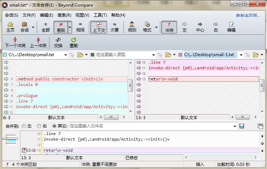 步骤4:在文本合并会话界面中,用带有问号图标的鼠标箭头直接点击右侧窗格的第13行,即可完成强制文本对齐的设置,操作结果界面如下图所示。