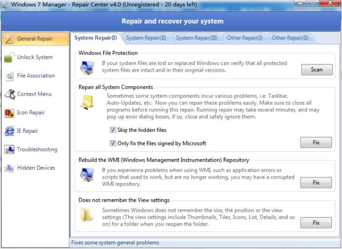 Repair Center 系统修复工具是从Windows 7 Manager中提取出来的一个系统修复工具,几乎包含了所以的系统常用修复功能,它最大的特点是一键修复,不需要复杂的操作就能完成系统修复。
