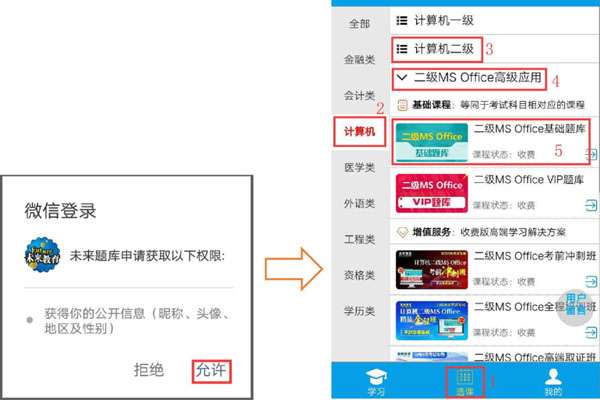1、以“二级MS Office基础题库”为例,选择“选课”→“计算机”→“计算机二级”→“二级MS Office高级应用”→“二级MS Office基础题库”。