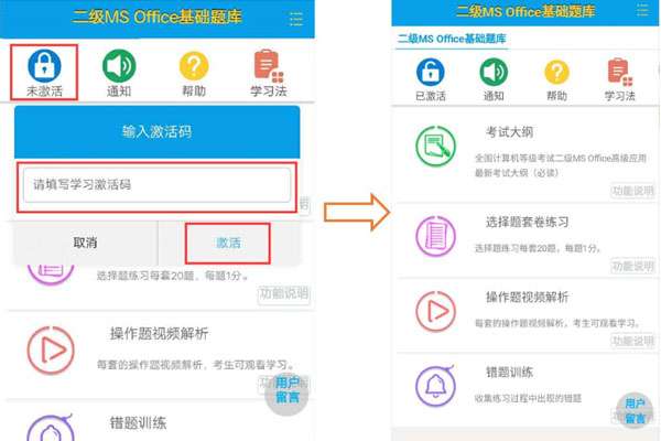 2、进入题库后,点击“未激活”按钮,在弹出的对话框中输入激活码,再点击“激活”按钮,就可以使用题库啦。