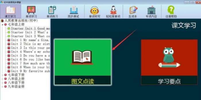 进入软件后有两个功能,分别是图文点读、学习要点。我们点击图文点读试试。