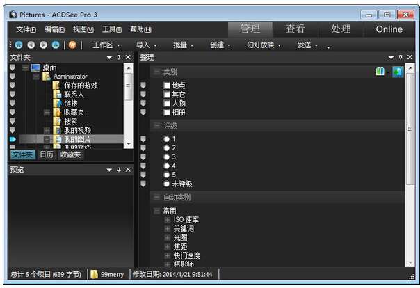 ACDSee Pro提供了良好的操作界面,简单人性化的操作方式,优质的快速图形解码方式,支持丰富的图形格式,强大的图形文件管理功能等等。ACDSee还有一个特点是快,与其他图像观赏器比较,ACDSee打开图像档案的速度无疑是相对的快。