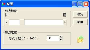 2.点击“配置”按钮,可以弹出屏保的配置界面,其中可以设置彩点绘制的速度和数量。3.点击“预览”按钮,可以实现全屏幕的预览。