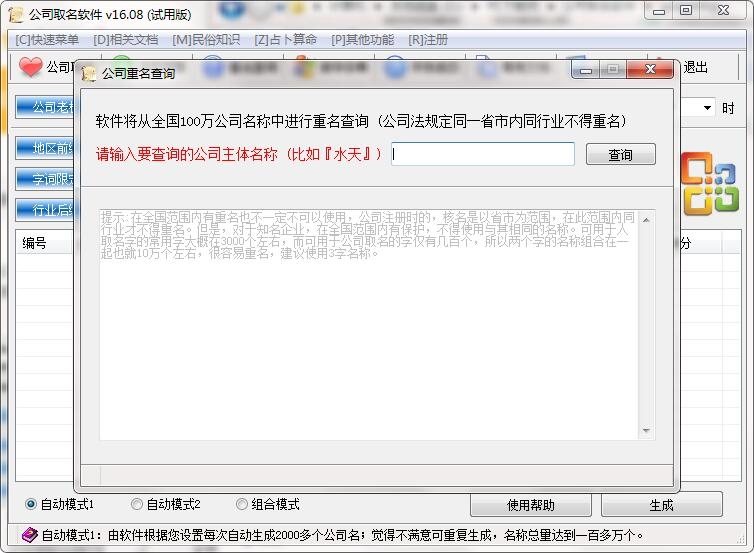 3.提供重名查询功能,迅速与100万个公司名对比。